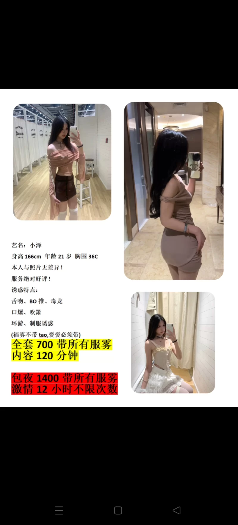 威客管理提示:要求付定金 保证金的,总之提前要钱的都是骗子 到地方遥控上门的,身材挺高挑的,外形看着整体都还不错。进门就是共浴,就是卫生间比较小,不是很能施展。然后你可以选择直接服务,也可以先聊天,挺健谈的。服务过程就从头开始给你舔,直到dd,很舒服,没齿感,可以让她调整姿势一边让她吹,你一边玩她,不抗拒的。小姐姐挺敏感的,水多的一批,叫床声也还挺好的。反正觉得可以试一试。