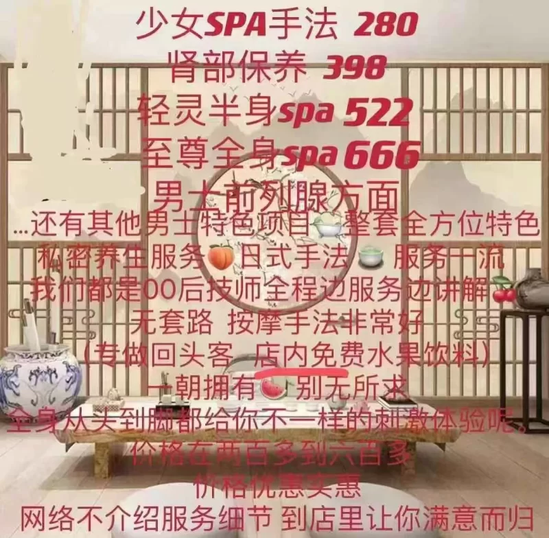 白天只有松骨 120元 技师少的可怜 还都是歪瓜裂枣 凌晨1点~5点有大活 有7个左右做大活的 也是不堪入目的级别 谈好298全套服务;还说是特价全部费用都包括(40分钟,浴资,没有其它小费和其它费用),洗澡就像环境差,里面就10平方大小。房间卫生一般,XJ服务更不好,就等于快餐,长像就更别提了。 买单时,收费确不一样298(服务费)+198(房间费)+15(一次性衣服)+29(浴资) 如果你要求小姐做KH了 出来时就变成398了